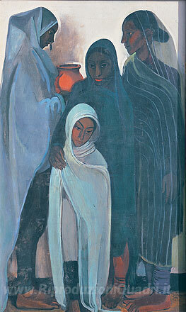 Ti offriamo una riproduzione artigianale su tela dell'opera famosa 'Hill Donne' di Amrita Sher-Gil, dal Museo delle Riproduzioni.