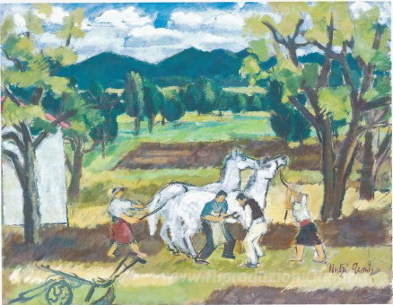 Ti offriamo una riproduzione artigianale su tela dell'opera famosa 'Horseshoeing' di Nutzi Acontz, dal Museo delle Riproduzioni.