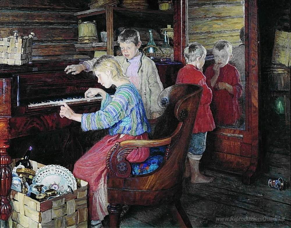 Benvenuto nella nostra selezione di dipinti a olio italiani, dove l'arte si fonde con l'eleganza dello stile italiano. Oggi vi presentiamo l'opera I bambini al pianoforte dell'illustre artista Nikolay Bogdanov-Belsky, un maestro in grado di catturare emozioni profonde attraverso pennellate sapienti e colori vibranti. La sua formazione accademica e il profondo legame con la tradizione pittorica russa si riflettono in ogni dettaglio di questo capolavoro.
