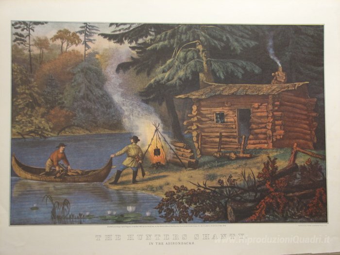 Ti offriamo una riproduzione artigianale su tela dell'opera famosa 'I cacciatori Shanty' di Currier and Ives, dal Museo delle Riproduzioni.