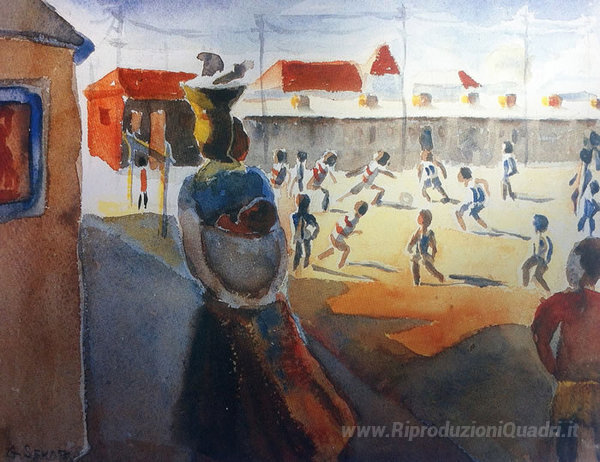 Ti offriamo una riproduzione artigianale su tela dell'opera famosa 'I calciatori' di Gerard Sekoto, dal Museo delle Riproduzioni.
