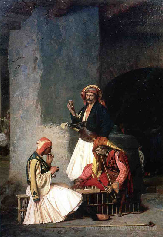 Ti offriamo una riproduzione artigianale su tela dell'opera famosa 'I giocatori alla spina' di Jean-Leon Gerome, dal Museo delle Riproduzioni.