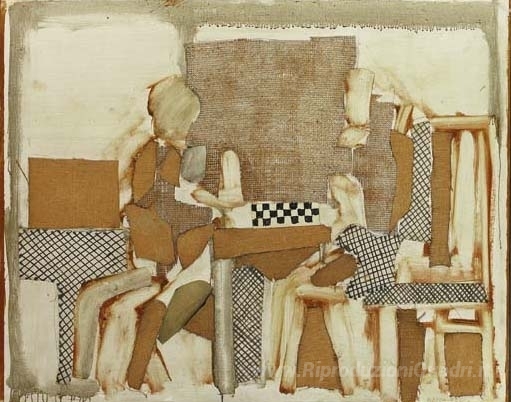 Ti offriamo una riproduzione artigianale su tela dell'opera famosa 'I giocatori' di Conrad Marca-Relli, dal Museo delle Riproduzioni.