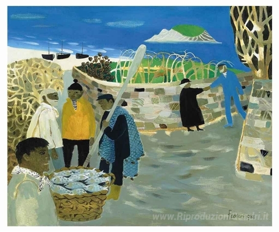 Ti offriamo una riproduzione artigianale su tela dell'opera famosa 'I pescatori irlandesi' di Mary Fedden, dal Museo delle Riproduzioni.