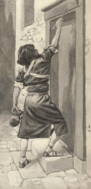 Ti offriamo una riproduzione artigianale su tela dell'opera famosa 'I segni sulla porta' di James Tissot, dal Museo delle Riproduzioni.
