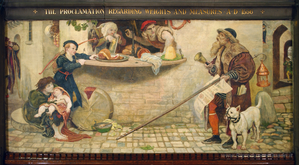 Ti offriamo una riproduzione artigianale su tela dell'opera famosa 'Il bando sui pesi e misure, 1556, illustrazione da 'Storia della' di Ford Madox Brown, dal Museo delle Riproduzioni.