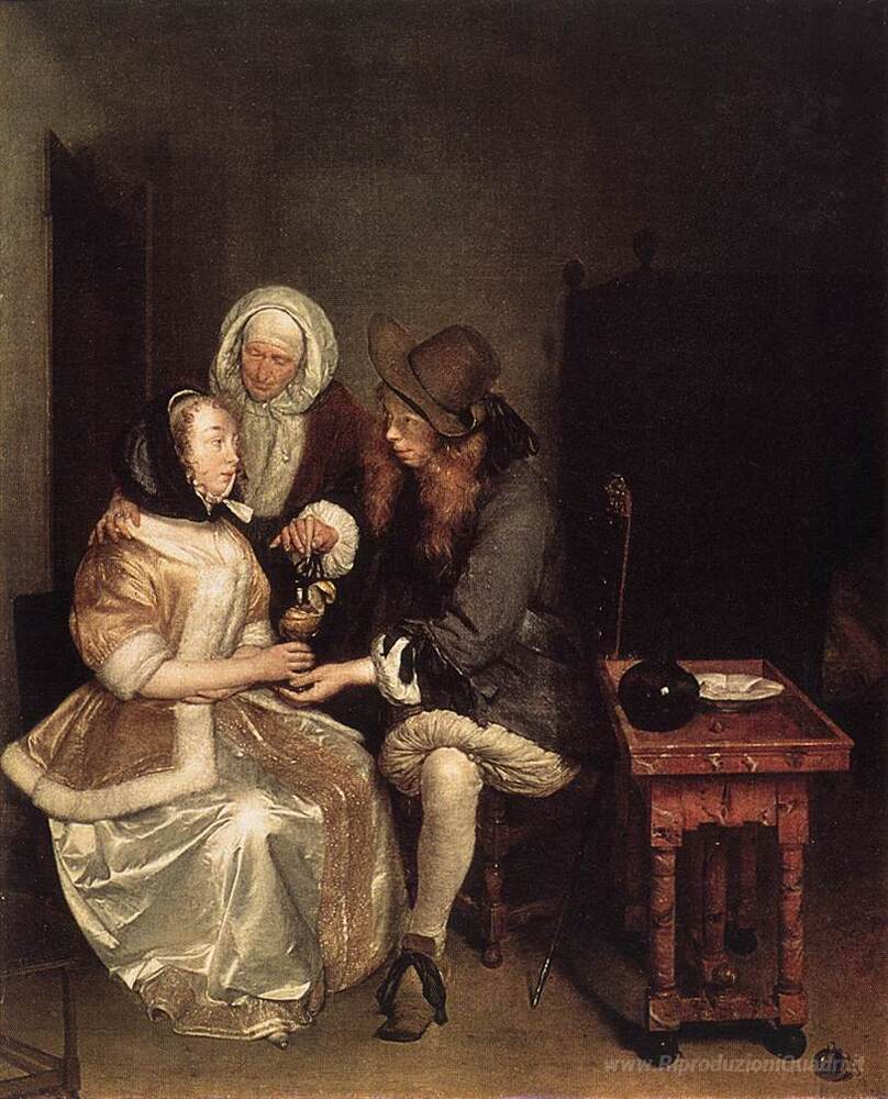 Ti offriamo una riproduzione artigianale su tela dell'opera famosa 'Il bicchiere di limonata' di Gerard Terborch, dal Museo delle Riproduzioni.