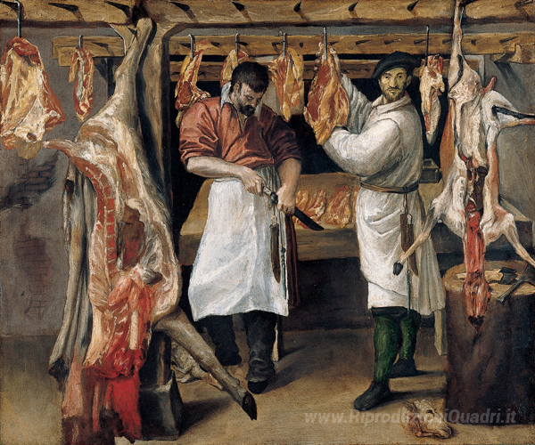 Ti offriamo una riproduzione artigianale su tela dell'opera famosa 'Il Butcher`s negozio' di Annibale Carracci, dal Museo delle Riproduzioni.