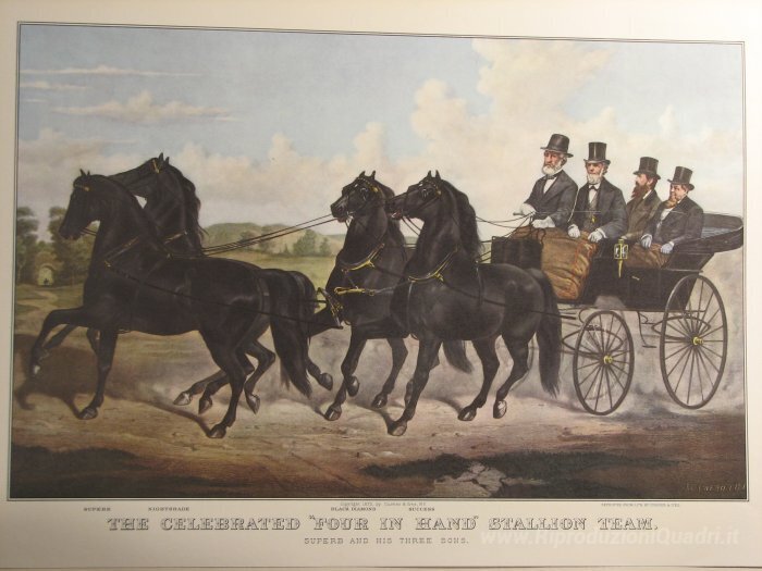 Ti offriamo una riproduzione artigianale su tela dell'opera famosa 'Il celebre Four in Hand Stallion Squadra' di Currier and Ives, dal Museo delle Riproduzioni.