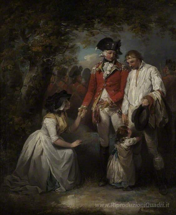 Ti offriamo una riproduzione artigianale su tela dell'opera famosa 'Il Disertore perdonato' di George Morland, dal Museo delle Riproduzioni.