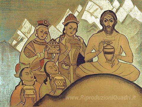 Ti offriamo una riproduzione artigianale su tela dell'opera famosa 'Il dono sacro' di Nicholas Roerich, dal Museo delle Riproduzioni.
