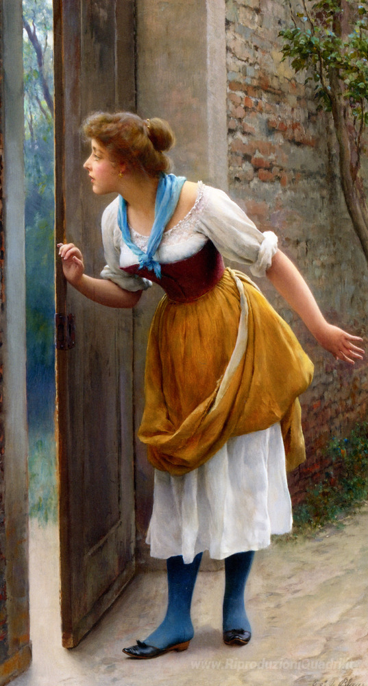 Ti offriamo una riproduzione artigianale su tela dell'opera famosa 'Il Eavesdropper' di Eugene de Blaas, dal Museo delle Riproduzioni.