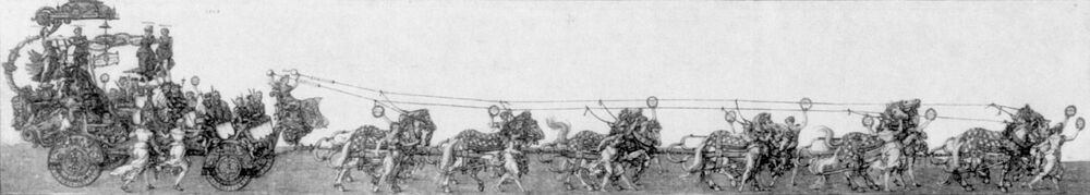 Ti offriamo una riproduzione artigianale su tela dell'opera famosa 'Il grande carro' di Albrecht Durer, dal Museo delle Riproduzioni.