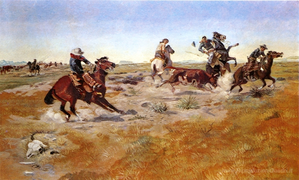Ti offriamo una riproduzione artigianale su tela dell'opera famosa 'Il Judith Basin Roundup' di Charles M. Russell, dal Museo delle Riproduzioni.
