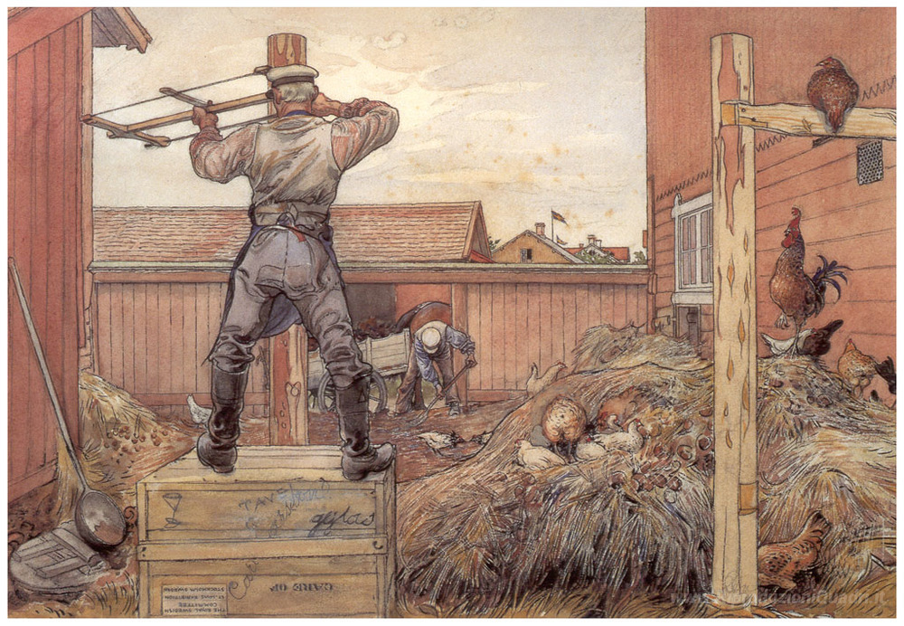 Ti offriamo una riproduzione artigianale su tela dell'opera famosa 'Il letamaio' di Carl Larsson, dal Museo delle Riproduzioni.
