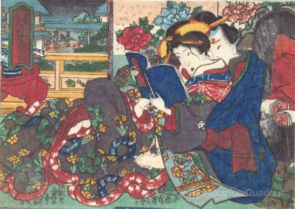 Ti offriamo una riproduzione artigianale su tela dell'opera famosa 'Il libro' di Utagawa Kunisada, dal Museo delle Riproduzioni.