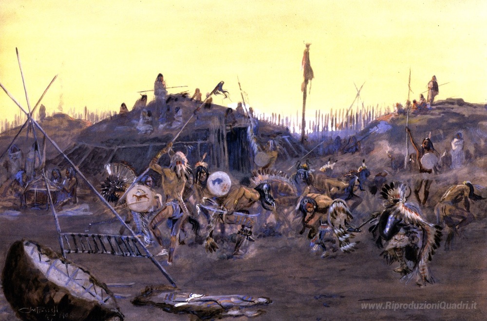 Benvenuti nel mondo affascinante dei dipinti a olio italiani, dove l'arte si fonde con la passione e la tradizione. In questa selezione esclusiva, vi presentiamo l'opera Il Mandan Danza dell'artista Charles M. Russell, un maestro indiscusso della rappresentazione della vita e delle culture del West americano. Le sue opere, caratterizzate da un'elegante mescolanza di colori vibranti e dettagli meticolosi, catturano non solo la bellezza della natura ma anche l'essenza delle tradizioni indigene.