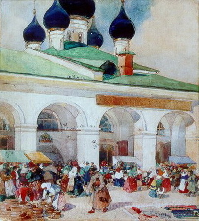 Ti offriamo una riproduzione artigianale su tela dell'opera famosa 'Il mercato di fuori del Khranilovs' di Konstantin Yuon, dal Museo delle Riproduzioni.