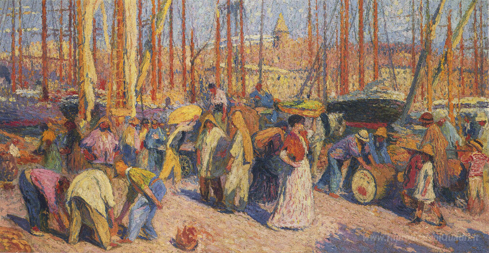 Ti offriamo una riproduzione artigianale su tela dell'opera famosa 'Il porto di Marsiglia' di Henri Martin, dal Museo delle Riproduzioni.