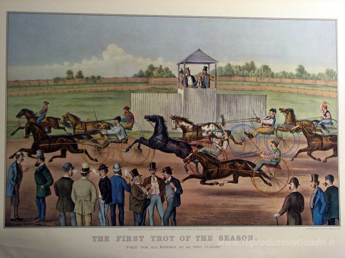 Ti offriamo una riproduzione artigianale su tela dell'opera famosa 'Il Primo Trotto della stagione' di Currier and Ives, dal Museo delle Riproduzioni.
