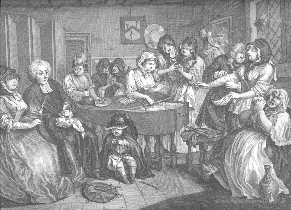 Ti offriamo una riproduzione artigianale su tela dell'opera famosa 'Il progresso di una prostituta, piastra 6' di William Hogarth, dal Museo delle Riproduzioni.