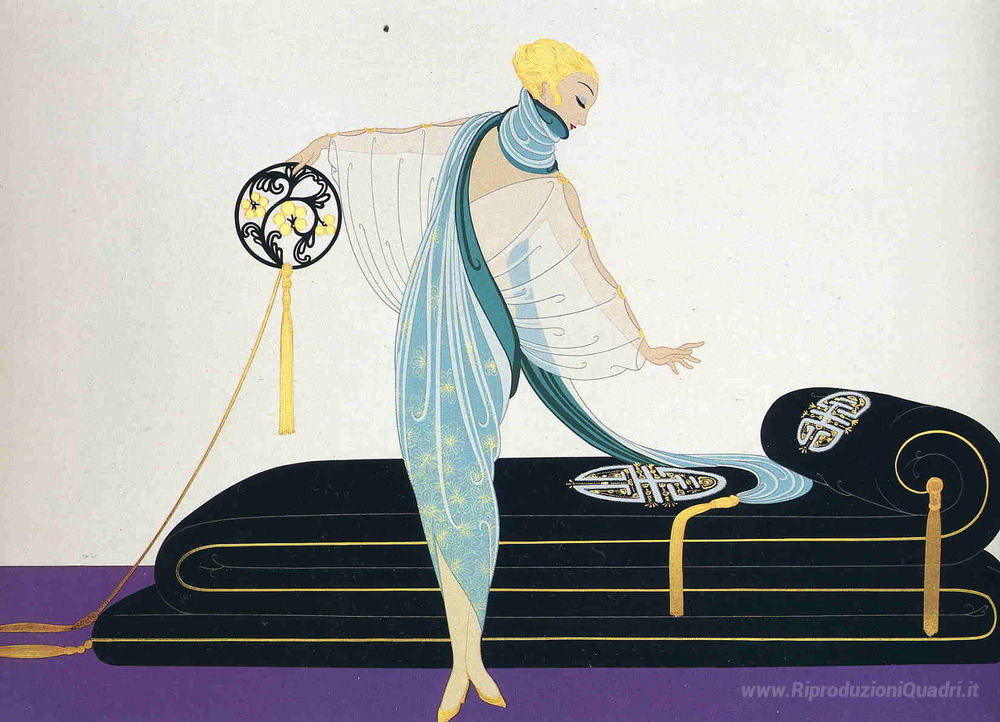 Ti offriamo una riproduzione artigianale su tela dell'opera famosa 'Il Salone' di Erte, dal Museo delle Riproduzioni.