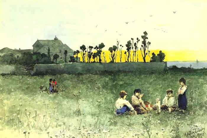 Ti offriamo una riproduzione artigianale su tela dell'opera famosa 'Il sole al tramonto' di Wilhelm Kotarbinski, dal Museo delle Riproduzioni.