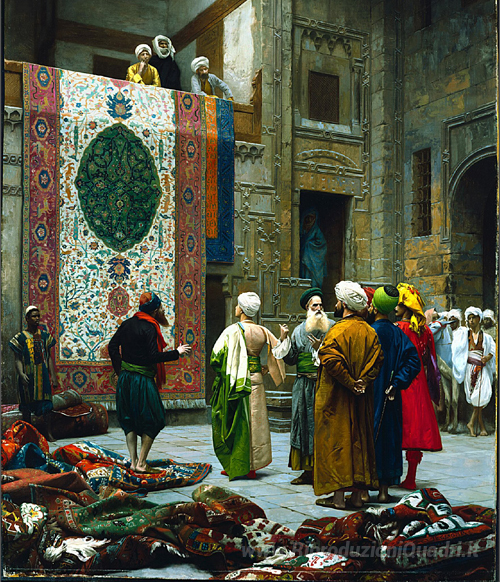 Ti offriamo una riproduzione artigianale su tela dell'opera famosa 'Il venditore di tappeti' di Jean-Leon Gerome, dal Museo delle Riproduzioni.
