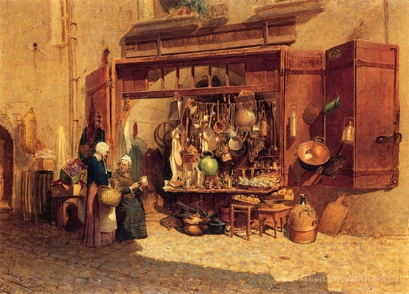Ti offriamo una riproduzione artigianale su tela dell'opera famosa 'Il Villaggio Peddler' di Louis Comfort Tiffany, dal Museo delle Riproduzioni.
