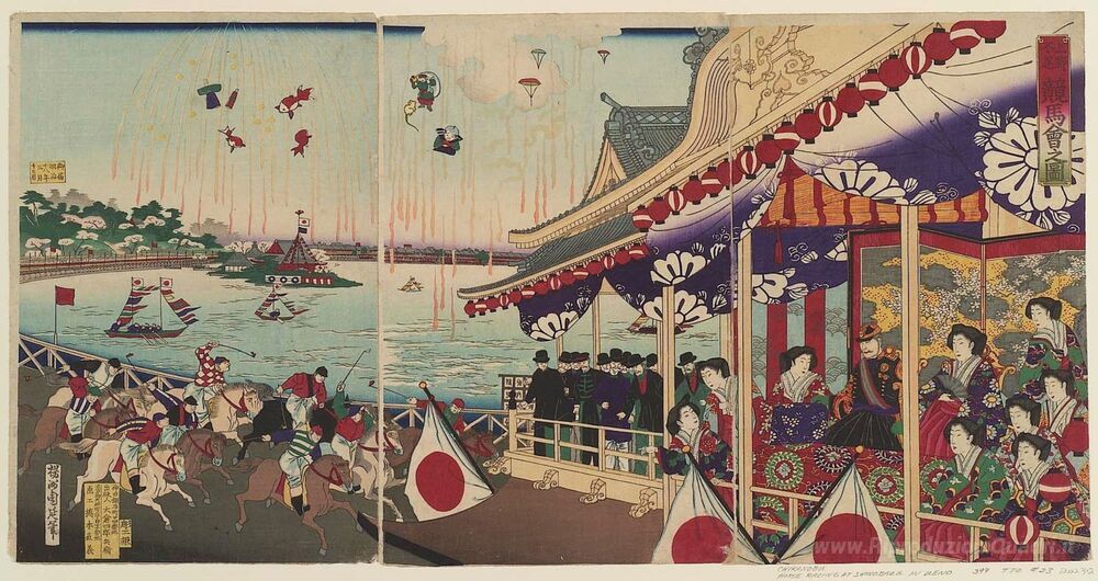 Ti offriamo una riproduzione artigianale su tela dell'opera famosa 'Illustrazione di Horse Racing a Shinobazu a Ueno' di Toyohara Chikanobu, dal Museo delle Riproduzioni.