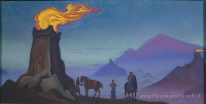 Ti offriamo una riproduzione artigianale su tela dell'opera famosa 'Incendi della vittoria (luci Sentinel sulle torri di Gobi)' di Nicholas Roerich, dal Museo delle Riproduzioni.