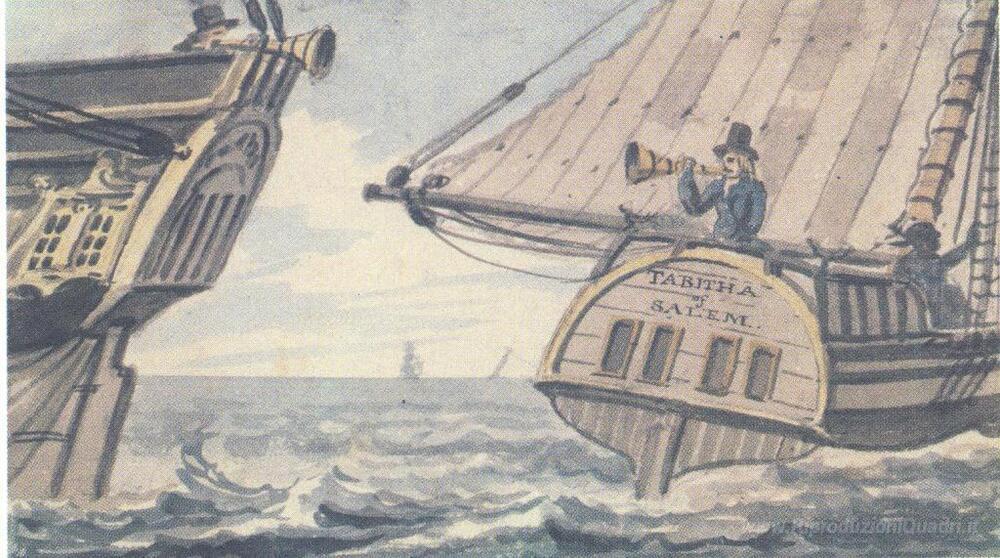 Ti offriamo una riproduzione artigianale su tela dell'opera famosa 'Incontro di due navi in ??mare' di Pavel Svinyin, dal Museo delle Riproduzioni.