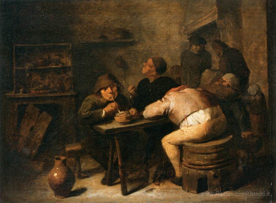 Ti offriamo una riproduzione artigianale su tela dell'opera famosa 'Interno con fumatori' di Adriaen Brouwer, dal Museo delle Riproduzioni.