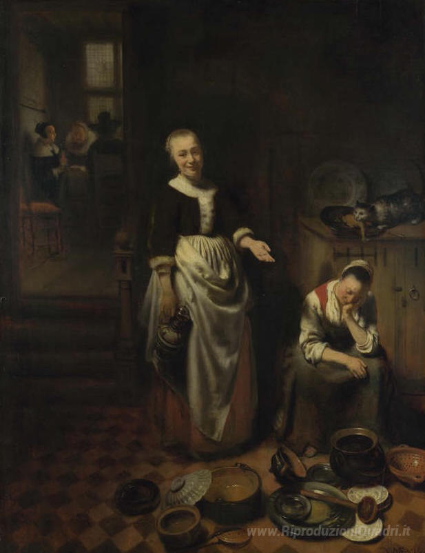 Ti offriamo una riproduzione artigianale su tela dell'opera famosa 'Interno con una cameriera Sleeping - The Idle Servan' di Nicolaes Maes, dal Museo delle Riproduzioni.