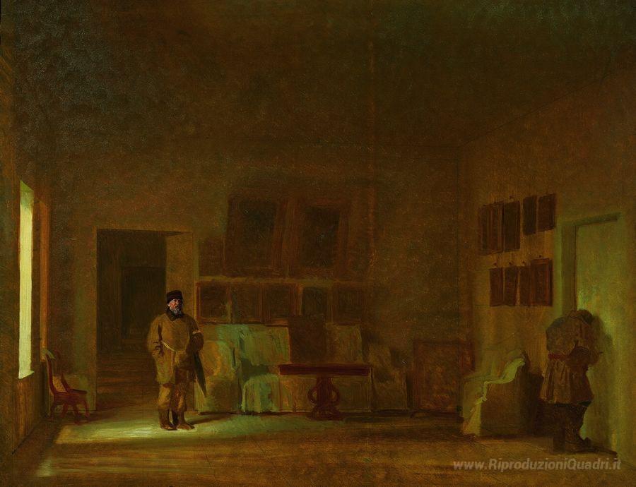 Ti offriamo una riproduzione artigianale su tela dell'opera famosa 'Ispezione della vecchia casa' di Ivan Kramskoy, dal Museo delle Riproduzioni.