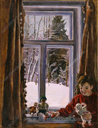 Ti offriamo una riproduzione artigianale su tela dell'opera famosa 'Katya con una bambola alla finestra' di Pyotr Konchalovsky, dal Museo delle Riproduzioni.