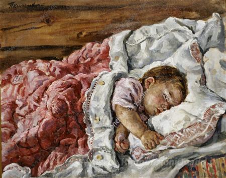 Ti offriamo una riproduzione artigianale su tela dell'opera famosa 'Katya dorme (sul lato sinistro)' di Pyotr Konchalovsky, dal Museo delle Riproduzioni.