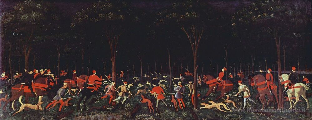Ti offriamo una riproduzione artigianale su tela dell'opera famosa 'La caccia nella foresta' di Paolo Uccello, dal Museo delle Riproduzioni.