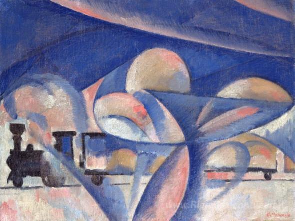 Ti offriamo una riproduzione artigianale su tela dell'opera famosa 'La composizione con il treno' di Olga Rozanova, dal Museo delle Riproduzioni.