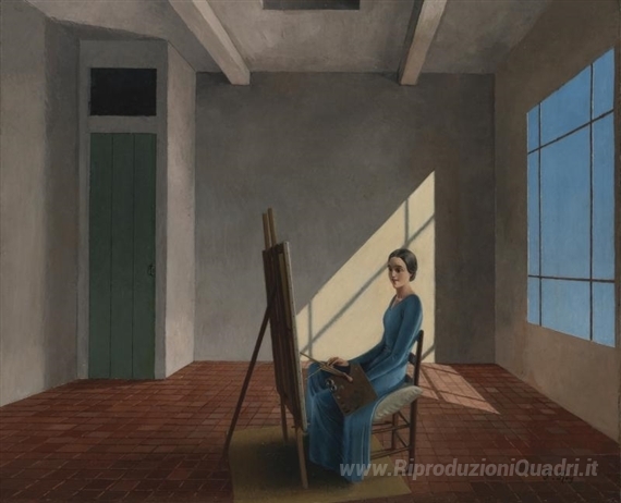Ti offriamo una riproduzione artigianale su tela dell'opera famosa 'La femme peintre' di Pierre Roy, dal Museo delle Riproduzioni.