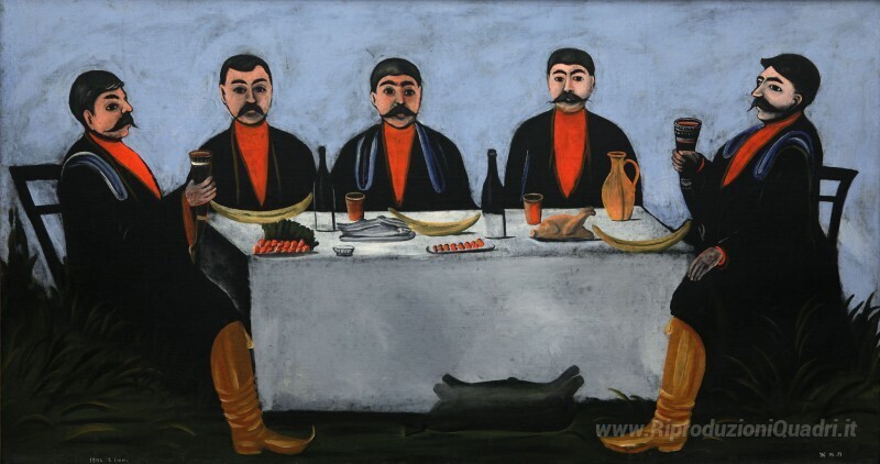 Ti offriamo una riproduzione artigianale su tela dell'opera famosa 'La Festa dei Cinque Principi' di Niko Pirosmani, dal Museo delle Riproduzioni.