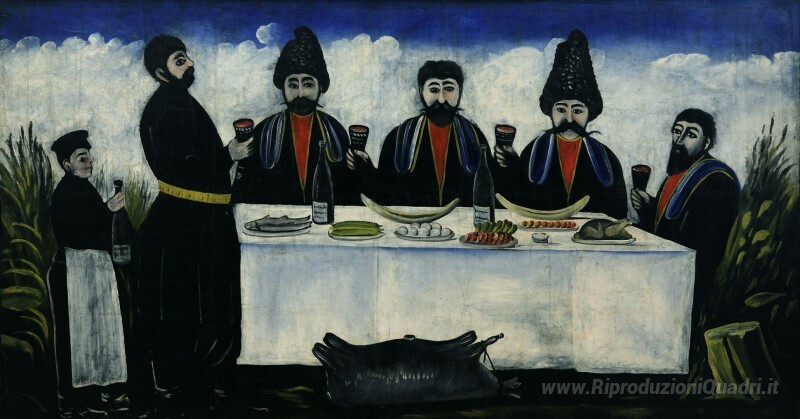 Ti offriamo una riproduzione artigianale su tela dell'opera famosa 'La festa di quattro cittadini' di Niko Pirosmani, dal Museo delle Riproduzioni.