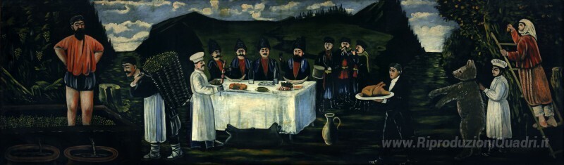 Ti offriamo una riproduzione artigianale su tela dell'opera famosa 'La festa in vintage' di Niko Pirosmani, dal Museo delle Riproduzioni.