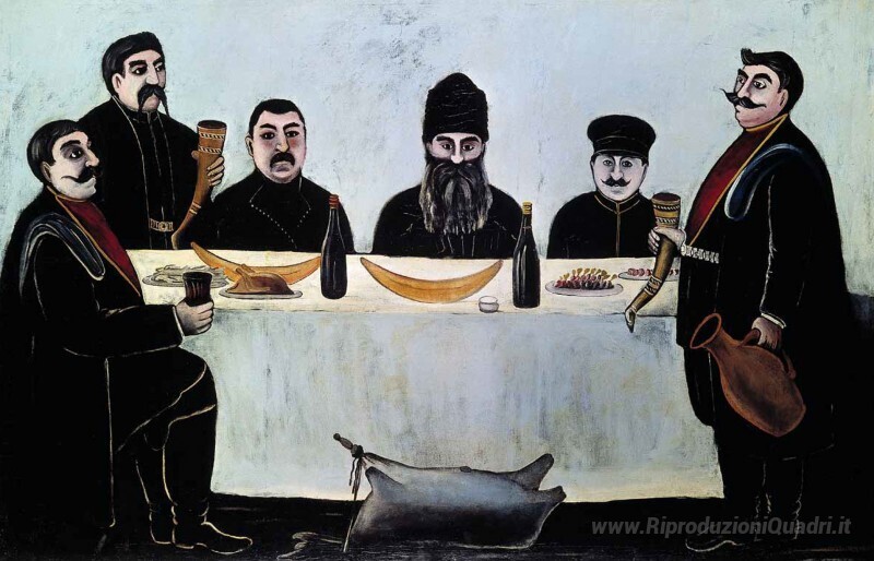 Ti offriamo una riproduzione artigianale su tela dell'opera famosa 'La festa' di Niko Pirosmani, dal Museo delle Riproduzioni.