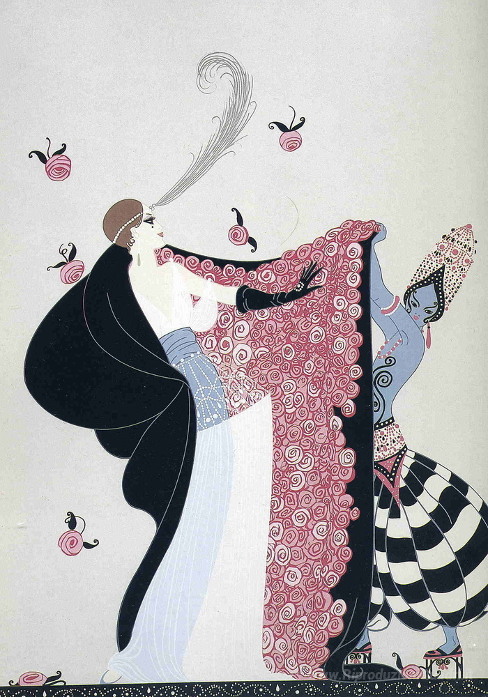 Ti offriamo una riproduzione artigianale su tela dell'opera famosa 'La fiorita Cape' di Erte, dal Museo delle Riproduzioni.