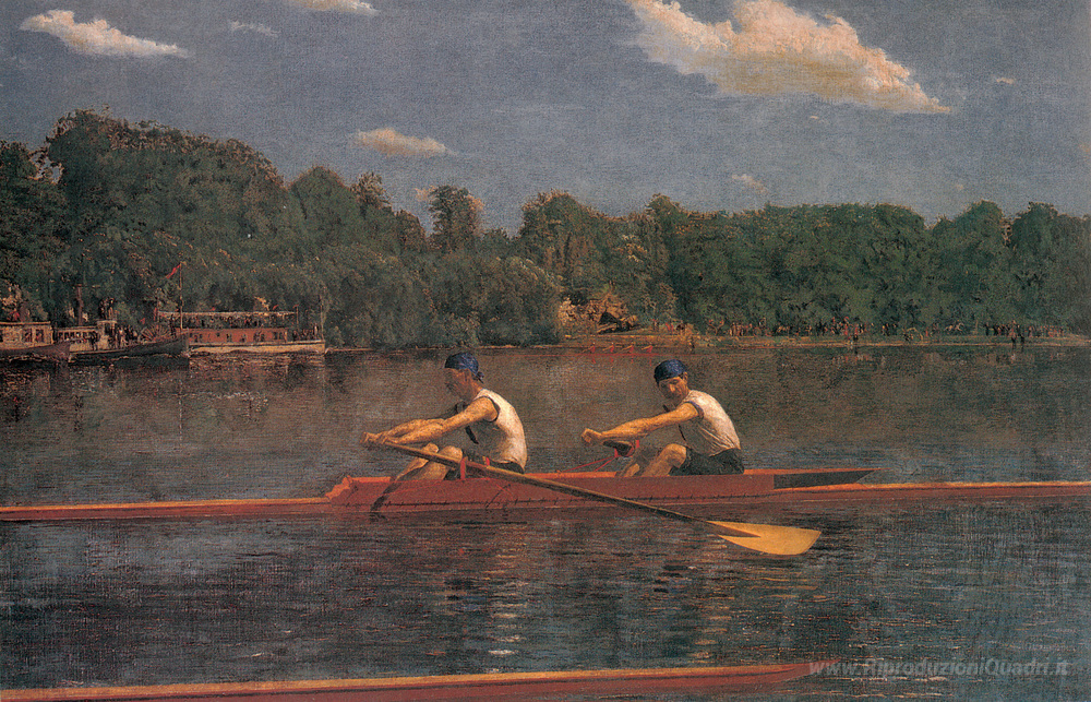 Nel mondo dell’arte, pochi dipinti riescono a catturare l'essenza di un momento così nitidamente come La Fratelli Biglin corsa di Thomas Eakins. Questa straordinaria opera, realizzata con la tipica maestria di Eakins, offre una rappresentazione vivace e intensa della competizione, riflettendo l'abilità dell'artista nell'immortalare soggetti umani nella loro autenticità. Catturando l’energia e la passione di una regata, il dipinto si distingue per la sua straordinaria attenzione ai dettagli e l’uso sapiente della luce, che conferisce profondità e vitalità alla scena.