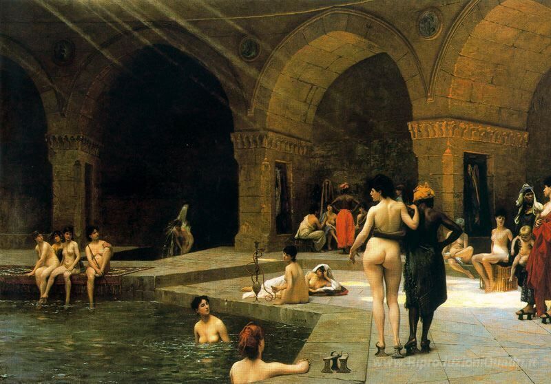 Ti offriamo una riproduzione artigianale su tela dell'opera famosa 'La grande piscina di Bursa' di Jean-Leon Gerome, dal Museo delle Riproduzioni.