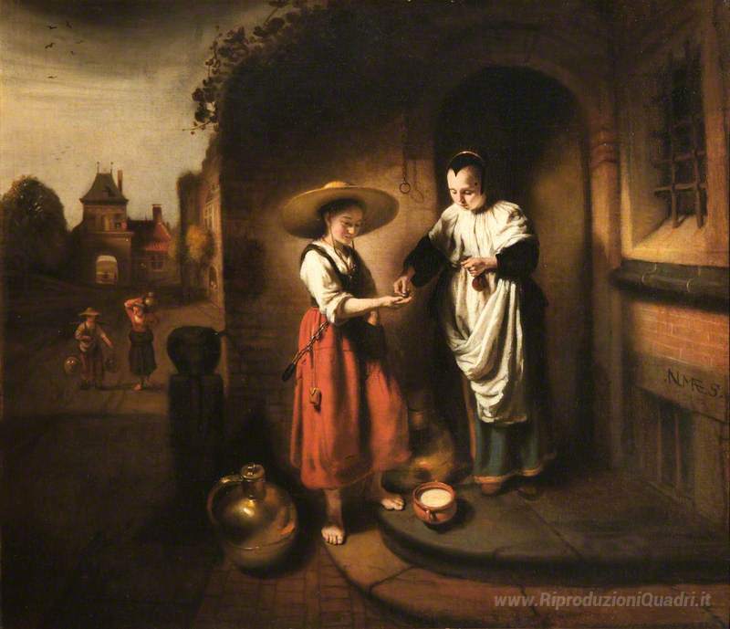 Ti offriamo una riproduzione artigianale su tela dell'opera famosa 'La lattaia' di Nicolaes Maes, dal Museo delle Riproduzioni.
