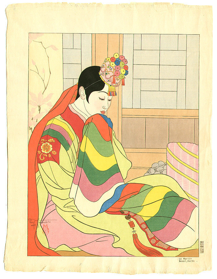 Ti offriamo una riproduzione artigianale su tela dell'opera famosa 'La Mariee. Coree' di Paul Jacoulet, dal Museo delle Riproduzioni.