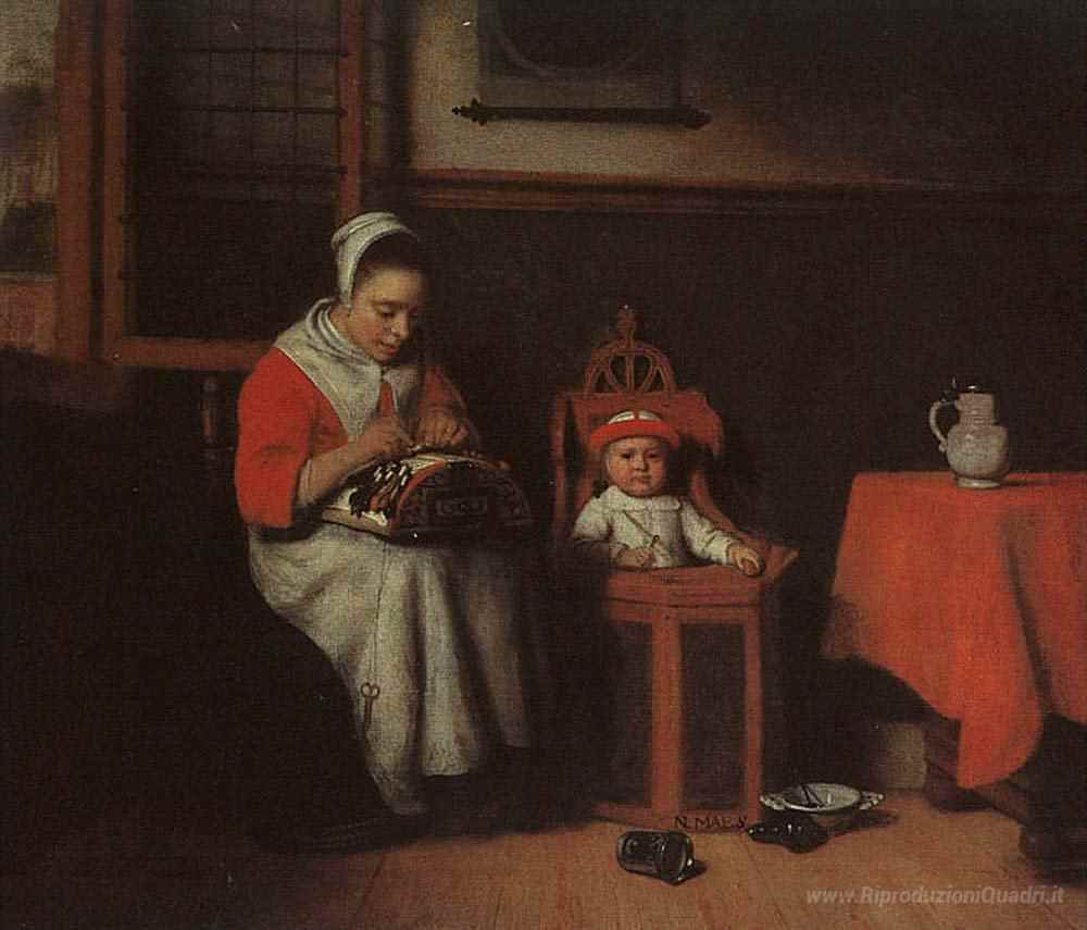 Ti offriamo una riproduzione artigianale su tela dell'opera famosa 'La merlettaia' di Nicolaes Maes, dal Museo delle Riproduzioni.